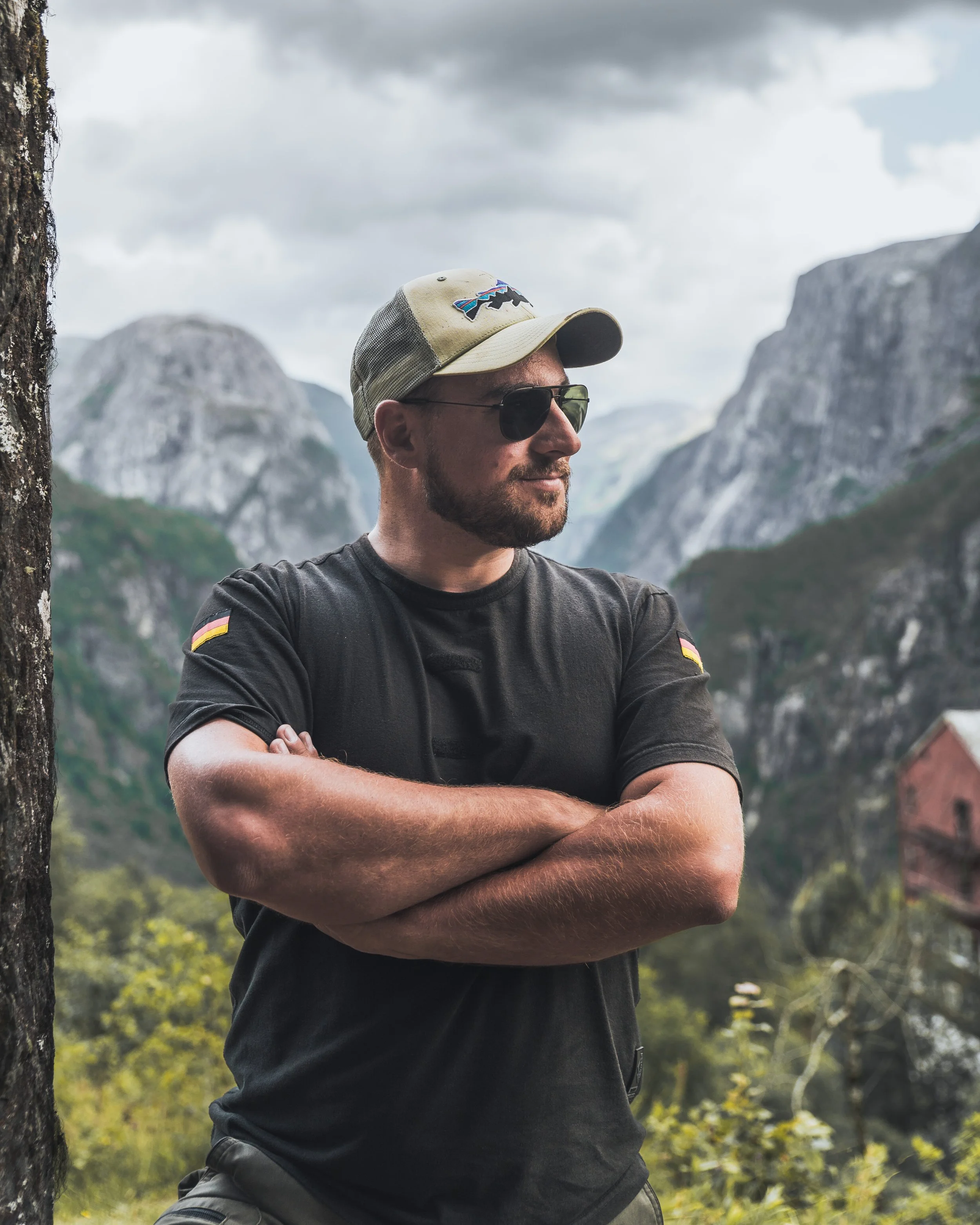 Bei Kaiserwetter bauen wir für den G eine Umrandung für den Kühler, damit er an Bergetappen nicht mehr überhitzt. Das Teil war einfach nicht mehr zu bekommen. So muss jetzt ein Kübel aus dem Baumarkt, ein Messer, Kabelbinder, etwas Kreativität und zwei Nachwuchsmechaniker auf einem Parkplatz am Fjord reichen. Ja, doch, das Ergebnis sieht ganz brauchbar aus.