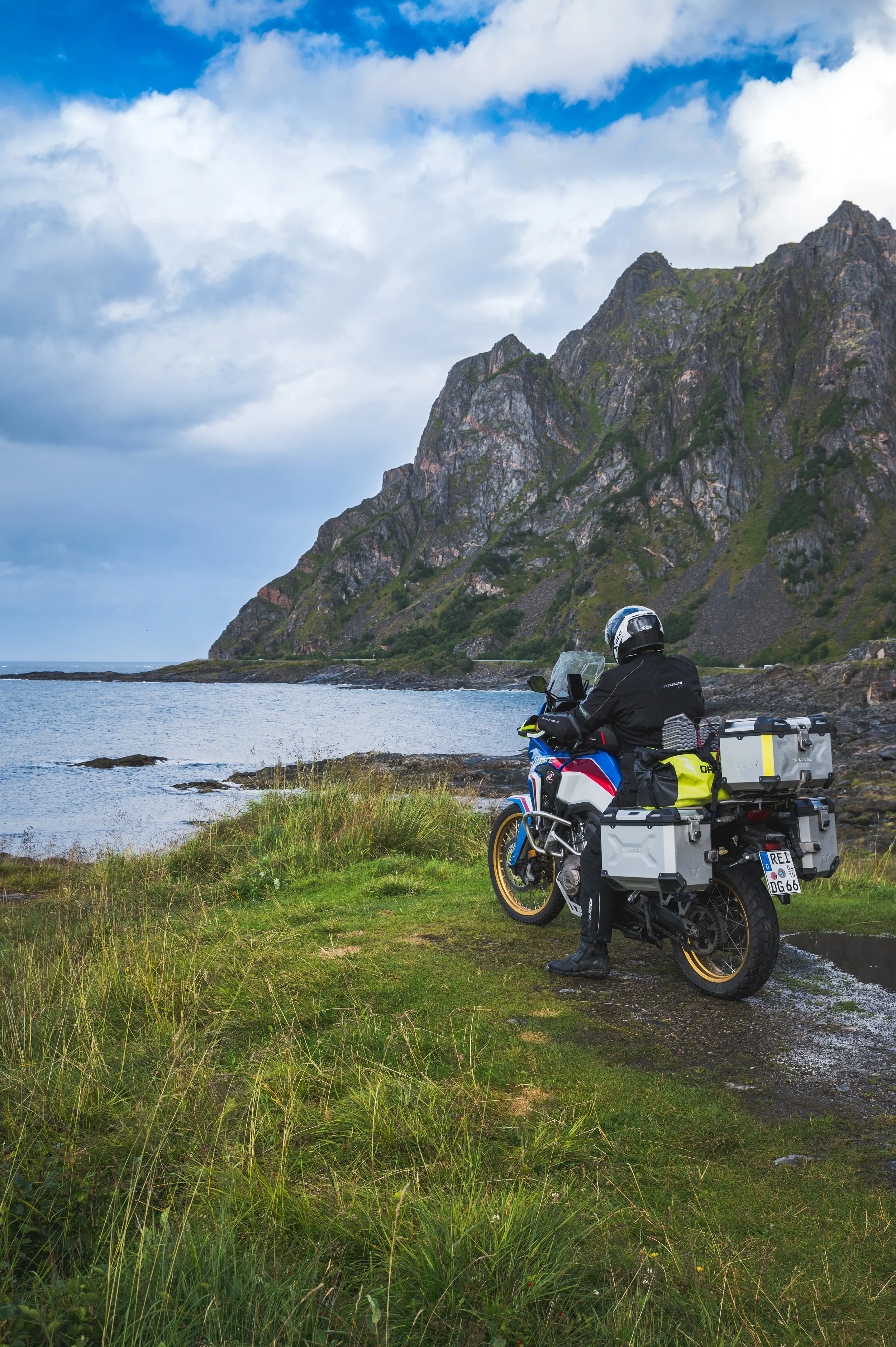 Am Horizont immer wieder dieses Wechselspiel aus Licht, Wolken, Wasser und den Bergen. Man fährt, sieht etwas, was man fotografieren möchte, doch nach Sekunden ändert sich das Licht und die Stimmung fällt in sich zusammen. Über mir kreist plötzlich ein Adler. Ich bleibe an der nächsten Gelegenheit stehen, packe die Kamera hervor und - nichts. Er ist weg, schade. Immerhin habe ich ihn kurz gesehen. Die Straße westlich der Vesterålen ist wirklich erfahrenswert. Schroffe Klippen, bizarre Bergstrukturen, die in der Ferne aufploppen. Daneben zum Zeil azurblaues Wasser, man fühlt sich wie in der Karibik. Wären da nur nicht die Temperaturen.