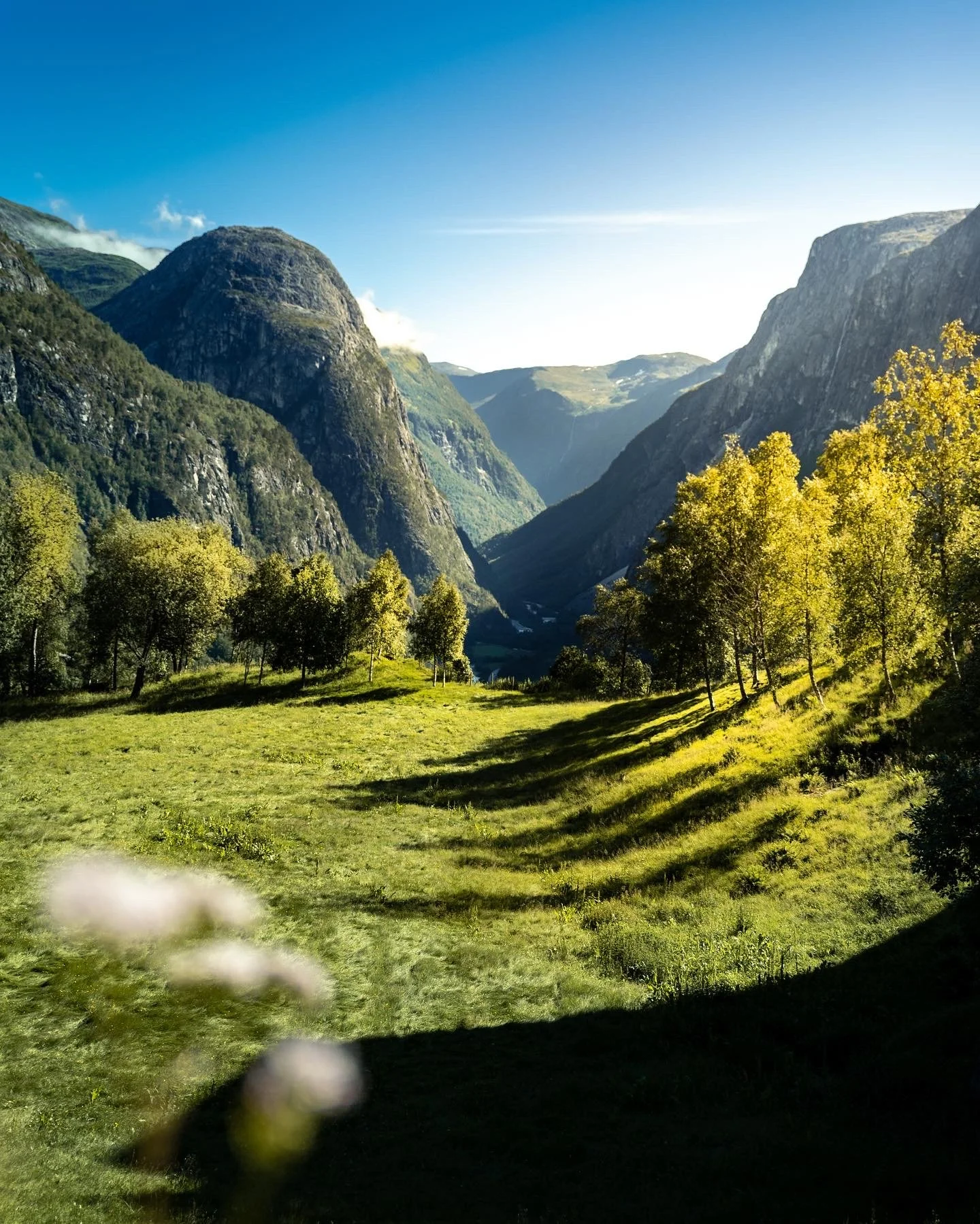 Endlich. Die Sonne. War ja nicht so schwer. Ich sattle den Gaul und verlasse schweren Herzens die mittlerweile so vertraute Gegend um Bergen. Ostwärts. Immer am Sørfjord entlang. Schon verrückt, wie weit man jetzt vom offenen Meer entfernt ist und doch könnte man von hier aus mit dem Boot direkt Richtung Bergen zurückfahren. Mitten durch die schroff abfallenden Bergrücken, nur unterbrochen durch Wasser und eine Straße. Vorbei an der Stadt Voss, die namensgebend für das teure Abzockerwasser in der Designerflasche gewesen sein dürfte, mit dem der/die oder das Nachwuchsbobo versucht der Öffentlichkeit seinen/ihren Reichtum zu offenbaren. Jo mei.